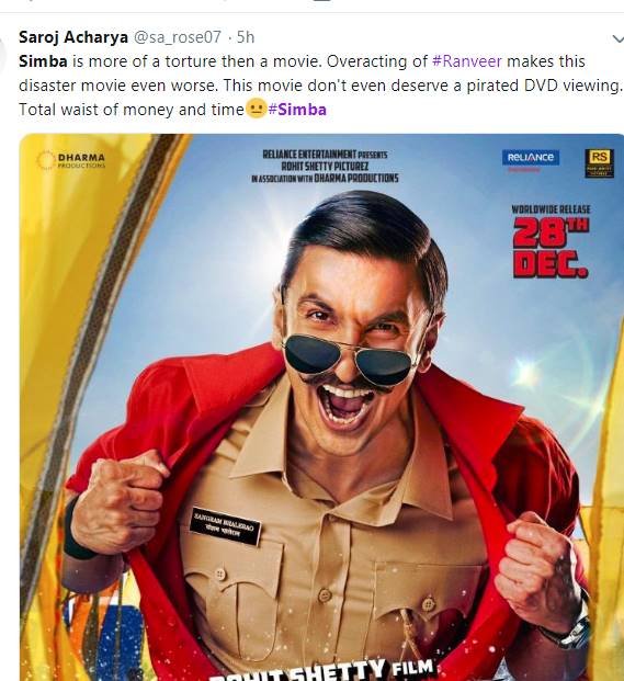 कुछ लोग रणवीर की सिंबा को वर्स्ट बता रहे हैं। सोशल मीडिया पर एक पोस्ट में दिखाई दिया...
