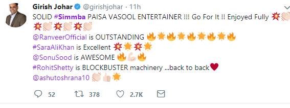 फिल्म में रणवीर की एक्टिंग को आउटस्टैंडिंग, सारा की अदाकारी को एक्सिलेंट और सोनू सूद के अभिनय को कमाल कहा गया है। गिरीश जौहर के मुताबिक फिल्म सिंबा एक ब्लॉकबस्टर हिट है।