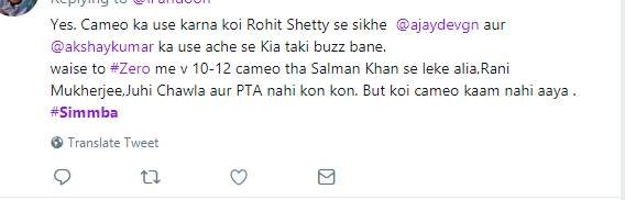 फिल्म में अजय देवगन 'सिंघम' वाले अवतार में नजर आते हैं। दरअसल, अजय फिल्म में केमियो कर रहे हैं। ऐसे में दर्शकों का कहना है कि फिल्म सिंबा में इन सब की जरूरत नहीं थी। ये सब काम नहीं आता। बता दें, इससे पहले शाहरुख खान की फिल्म जीरो रिलीज हुई जिसमें ढेरों केमियो रोल दिखाए गए। जीरो में सलमान खान, जूही चावला, करिश्मा कपूर और श्रीदेवी नजर आई थीं। ऐसे में फैन्स ने कहा कि ये सब काम नहीं आता।