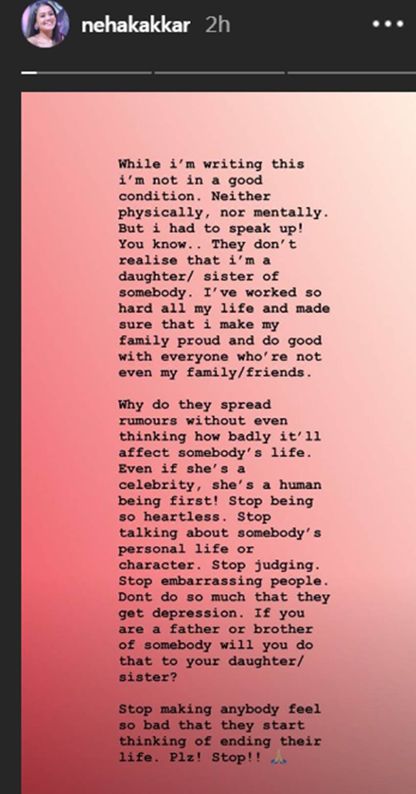 नेहा ने अपने इंस्टाग्राम अकाउंट पर स्टोरी को शेयर करते हुए लिखा, ‘जब मैं ये पोस्ट लिख रही हूं उस वक्त मैं जरा भी ठीक स्थिती में नही हूं, ना ही मानसिक, ना ही शारीरिक। मगर मुझे फिर भी बोलना पड़ रहा है’। नेहा ने आगे लिखा, ‘क्या आप जानते हैं कि उन्हें जरा भी अहसास नही हैं कि मैं किसी की बेटी और बहन हूं। मैंने अपनी पूरी जिंदगी में कड़ी मेहनत कि है ताकी मैं अपने परिवार को और सबको गर्व महसूस करवा सकूं जो कि ना तो मरे दोस्त हैं और ना परिवार का हिस्सा’।