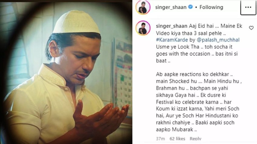 बॉलीवुड सिंगर शान ने सोशल मीडिया पर अपनी फोटो को शेयर कर कैप्शन लिखा, ‘आपको और आपकी फैमिली को ईद मुबारक।’ इसके बाद लोग उन्हें धर्म को लेकर ट्रोल करने लगे। इसके बाद उन्होंने भी ट्रोल्स को करारा जवाब दिया और लिखा, ‘आज ईद है। मैंने एक वीडियो किया था 3 साल पहले। पलाश मुच्छल का ‘करम कर दे’। उसमें ये लुक था… तो सोचा कि ये त्योहार के हिसाब ठीक लग रहा है… बस इतनी सी बात है… ।’