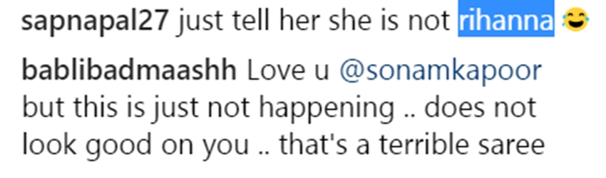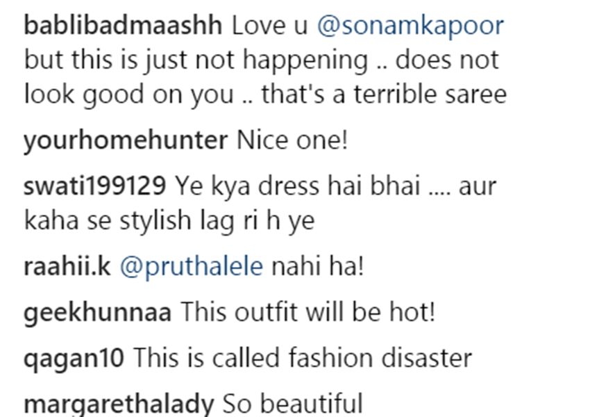 सोनम की बहन रेहा ने इन तस्वीरों को कैप्शन देते हुए लिखा- ‘इस डेनिम साड़ी से प्यार हो गया है। ड्रैप्ड इन डेनिम।’ वहीं सोशल मीडिया यूजर्स के रिएक्शन कुछ इस प्रकार के थे- एक यूजर कहता – सोनम आपसे बहुत प्यार है लेकिन यह आप पर सूट नहीं कर रहा। आप पर बिलकुल अच्छा नहीं लग रहा। टैरेबल साड़ी। एक यूजर लिखता- ये क्या ड्रेस है भाई, और कहां से स्टाइलिश लग रहा है। एक यूजर ने लिखा ये फैशन डिजास्टर है।