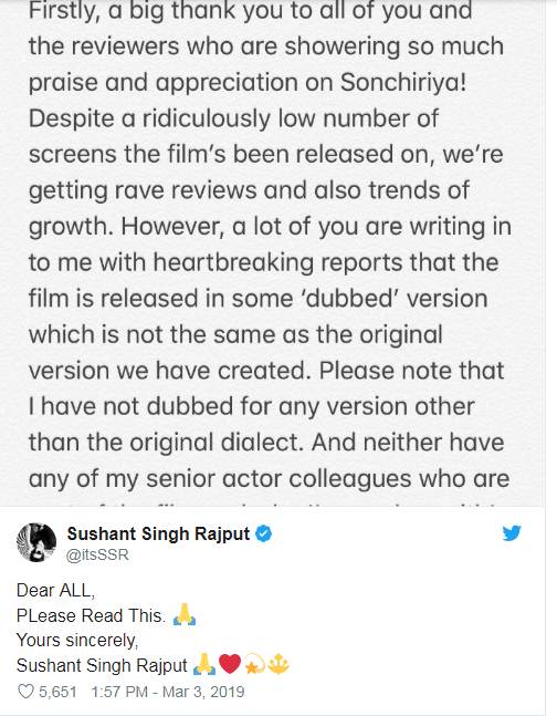 सुशांत ने लिखा- ‘मेरे प्यार दर्शक, सबसे पहले मैं आपको और फिल्म समीक्षकों को शुक्रिया कहता हूं, जिन्होंने सोनचिड़िया को लेकर मुझे प्यार जताया। मुझे लोगों से जानकारी मिली है कि कई सिनेमाहॉल में फिल्म का डब वर्जन चलाया जा रहा है, जो कि ऑरिजनल वर्जन से अलग है। ध्यान देने वाली बात यह है कि हमने लोकल भाषा के अलावा इस फिल्म को अन्य वर्जन में रिलीज नहीं किया है। न फिल्म का कोई भी सीनियर एक्टर डब वर्जन का हिस्सा है। यदि किसी थियेटर में डब वर्जन चलाया जा रहा है तो उसका नाम मुझे बताएं। मैं नहीं चाहता कि हमारी मेहनत पर पानी फिर जाए।’