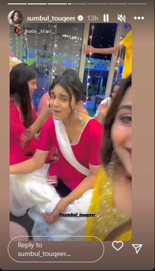 एक वीडियो सुंबुल ने अपनी इंस्टाग्राम स्टोरी पर शेयर की है, जिसमें वह अपने हाथों में मेहंदी लगवा रही हैं। पिता की शादी की खुशी उनके चेहरे पर साफ नजर आ रही है। इस दौरान उनकी बहन और परिवार के लोग भी नजर आ रहे हैं। बैकग्राउंड में ‘ढोली तारो ढोल बाजे’ गाना भी बज रहा है।