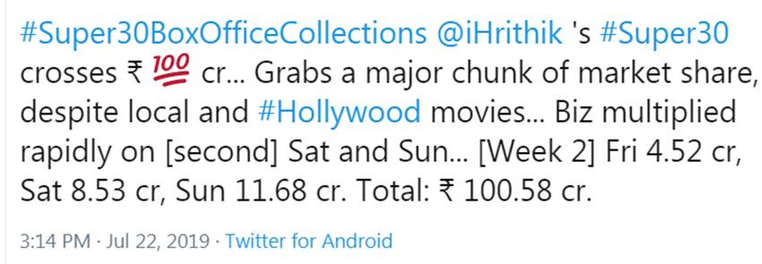 ट्रेड एनालिस्ट तरण आदर्श फिल्म की कमाई के बारे में लिखते हैं- सुपर 30 की दूसरे वीक के शनिवार को वापसी हुई है। फिल्म ने मुंबई और दिल्ली यूपी में जबरदस्त छलांग लगाई है। फिल्म के कुछ शोज ट्रेंड में रहे हैं। फिल्म 100 करोड़ की कमाई करने में हो सकती है। फिल्म लगातार मजबूती के साथ टिकी हुई है। सुपर 30 की कमाई की बात करें तो फिल्म ने 19 जुलाई को 4 करोड़ 51 लाख और 20 जुलाई को 8 करोड़ 53 लाख रुपए की कमाई की है। 21 जुलाई की कमाई को मिलाकर फिल्म का कुल कलेक्शन 100 करोड़ 58 लाख रुपए हो गया है।