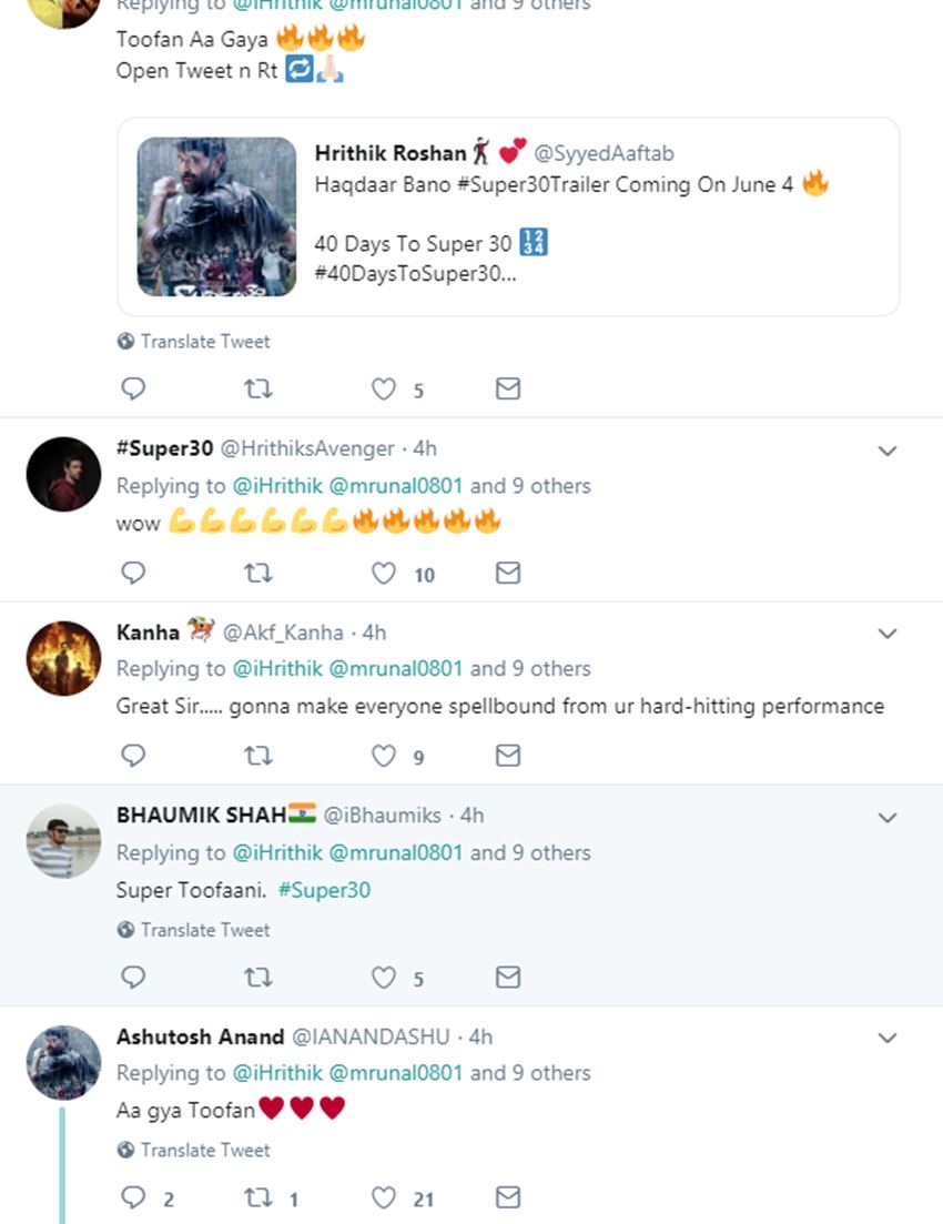 सुपर30 के ट्रेलर रिलीज को लेकर ऋतिक ने कहा कि उनकी फिल्म का ट्रेलर 4 जून को आएगा। तो वहीं ऋतिक की ये फिल्म सिनेमाघरों में 12 जुलाई को रिलीज होगी। देखें ऋतिक की अपकमिंग फिल्म का पोस्टर:-
