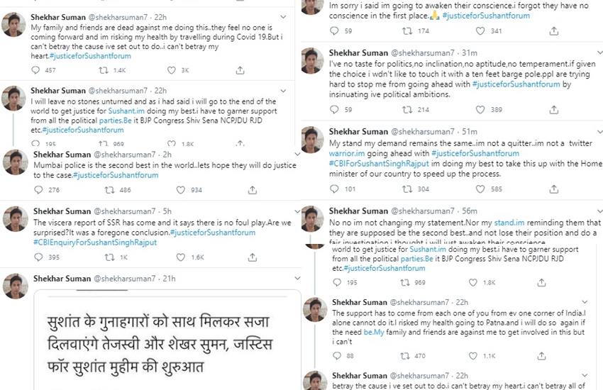 ऐसे में अब शेखर सुमन ने भी कुछ ट्वीट्स किए। शेखर सुमन ने अपने ट्वीट में कहा कि वह कोरोना के माहौल में जोखिम लेकर पटना गए। सभी ने कहा कि वह इन सब में इंवॉल्व न हों। शेखर सुमन ने ये भी बताया कि उनका परिवार नहीं चाहता था कि वह इसमें इतना घुसें। एक के बाद एक शेखर सुमन ने कई ट्वीट किए। साथ ही कहा कि वह तब ही दम लेंगे जब सुशांत को जस्टिस मिलेगा।