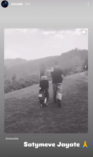 रिया के भाई शोविक चक्रवर्ती ने अपने इंस्टाग्राम की स्टोरी पर एक्ट्रेस की एक फोटो शेयर की है। इस तस्वीर में शोविक और एक्ट्रेस पहाड़ पर चलते हुए नजर आ रहे हैं। तस्वीर शेयर करते हुए उन्होंने कैप्शन में लिखा कि सत्यमेव जयते (सत्य की ही जीत होती है)। बता दें कि दोनों भाई-बहनों को 2020 में सुशांत की मौत के बाद सामने आए एक कथित ड्रग केस में गिरफ्तार किया गया था।
