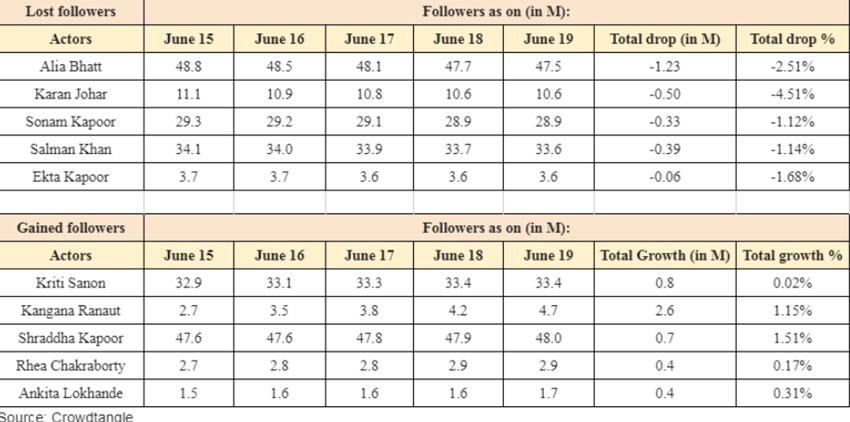 उनके करीब पांच लाख फैंस ने उन्हें अनफॉलो कर दिया है। सलमान खान के फॉलोअर्स 1.14 प्रतिशत कम हुए हैं। करन जौहर के बाद आलिया भट्ट को सबसे ज्यादा (2.51 प्रतिशत) फैंस खोने पड़े हैं। (विस्तृत टेबल नीचे देखें।)