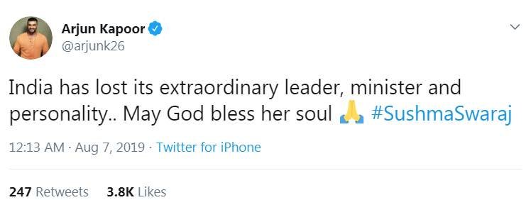 अर्जुन कपूर ने सोशल मीडिया पर सुषमा स्वराज के निधन पर अपना दुख जताया है। अर्जुन ने लिखा- भारत ने एक महान नेता और शख्सियत को खो दिया। भगवान उनकी आत्मा को शांति दें।