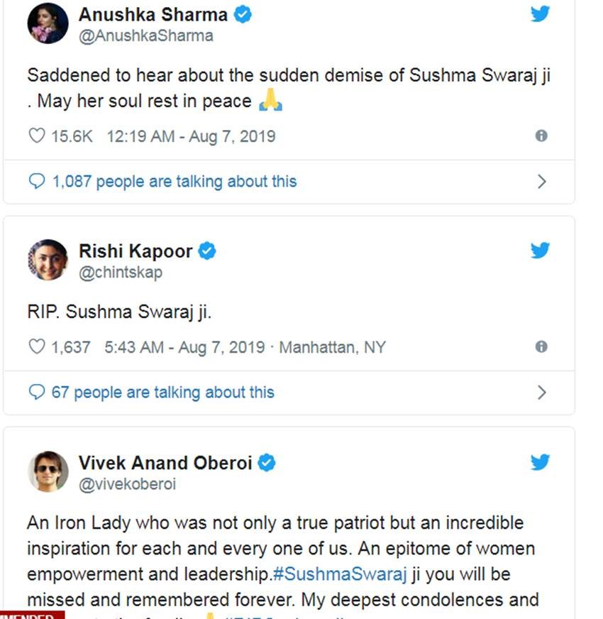 अनुष्का शर्मा, ऋषि कपूर और विवेक ओबरॉय ने भी सुषमा स्वराज के निधन पर दुख जताया है। अनुष्का ने लिखा कि वह सुषमा स्वराज के अचानक निधन की खबर से सदमे में हैं। वहीं विवेक ने बीजेपी लीडर को आयरन लेडी बताया है।