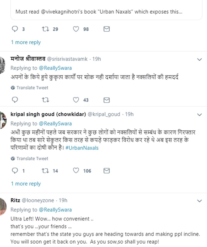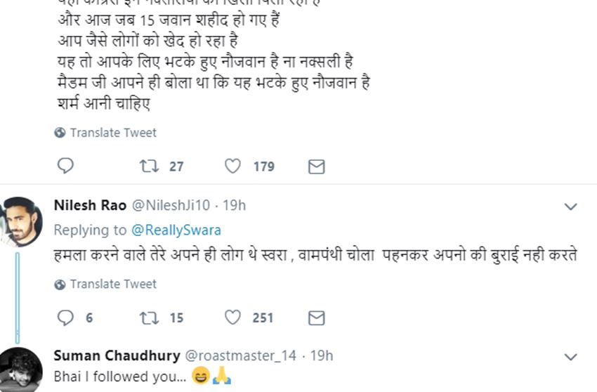 स्वरा का ये ट्वीट आते ही लोग उनपर निशाना साधने लगे। देखते ही देखते स्वरा ट्रोल होने लगीं। ट्रोल करने वाले यूजर्स लिखने लगे कि, ‘तुमने ऐसे लोगों की तरफदारी की थी..अब क्यों आंसू बहा रही हो’। तो वहीं कुछ ने लिखा कि- हमला करने वाले भी तेरे ही अपने थे स्वरा, वामपंथी चोला पहन कर अपनों की बुराई नहीं करते। ऐसे ही एक अन्य ने लिखा- अपनों के किए गए कुकृत्यों पर शोक नहीं जताते।