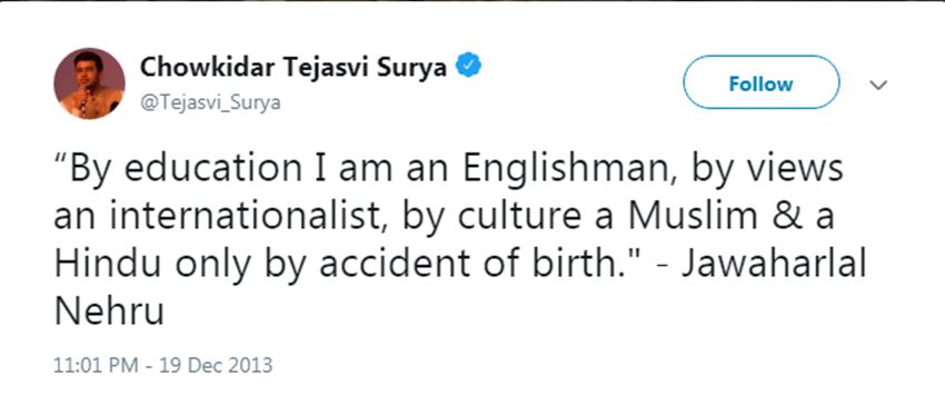 तेजस्वी सूर्या को लोकसभा प्रत्याशी बनाए जाने के बाद से ही सोशल मीडिया में उनके कुछ पुराने ट्वीट्स रिट्वीट होने लगे। ऐसा ही एक ट्वीट वायरल हुआ जिसे फिल्म एक्ट्रेस स्वरा भास्कर ने भी रिट्वीट किया है। दरअसल ये ट्वीट 19 दिसंबर 2013 का है। तब इस ट्वीट में तेजस्वी सूर्या ने लिखा था- शिक्षा से मैं एक अंग्रेज हूं, विचारों से अंतर्राष्ट्रवादी, कल्चर से मुसलमान और हिंदू सिर्फ दुर्घटनावश जन्म से: जवाहर लाल नेहरू।