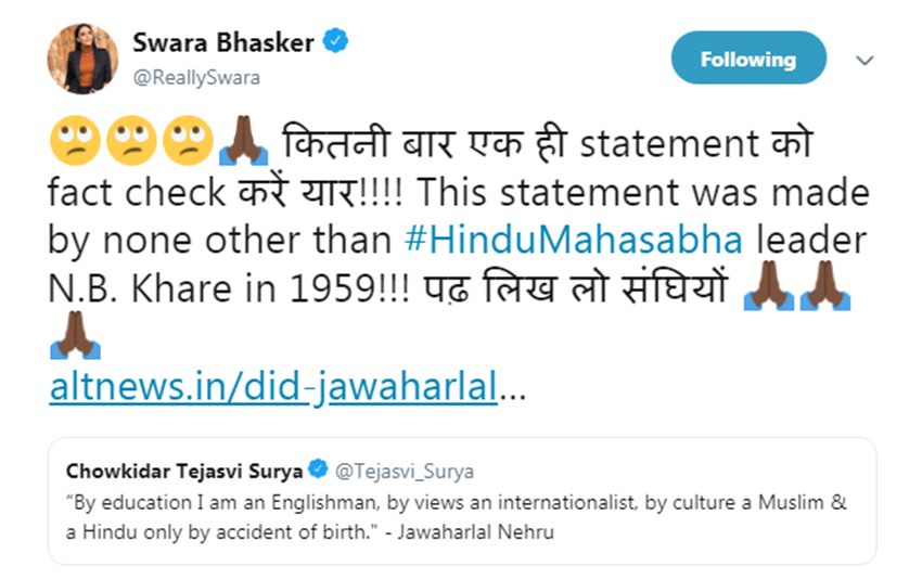 इस ट्वीट को रिट्वीट करते हुए स्वरा भास्कर ने लिखा- कितनी बार एक ही स्टेटमेंट का फैक्ट चेक करें यार। ये कथन किसी और का नहीं बल्कि 1959 में हिंदू महासभा के नेता एनबी खरे का है। पढ़ लिख लो संघियों।