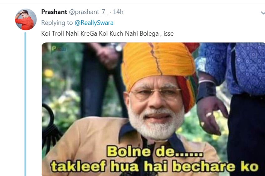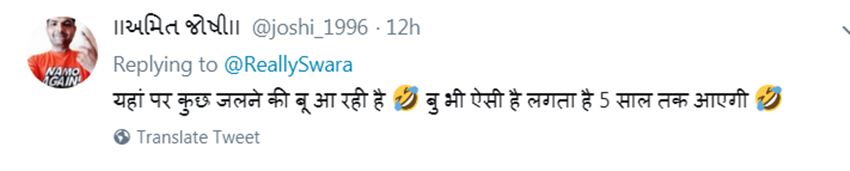 स्वरा के इस ट्वीट पर एक यूजर ने अपना रिएक्शन देते हुए लिखा- कोई ट्रोल नहीं करेगा, कोई कुछ नहीं बोलेगा इसे, बोलने दो, तकलीफ हुई है बेचारों को। वहीं एक यूजर ने लिखा- आप बताइए कन्हैया कुमार का क्या। परेशान मत होइए आपका भविष्य भी अंधकार में ही है। एक यूजर ने लिखा- लगता है यहां कुछ जलने की बू आ रही है, बू भी आएगी वो भी 5 सालों तक।