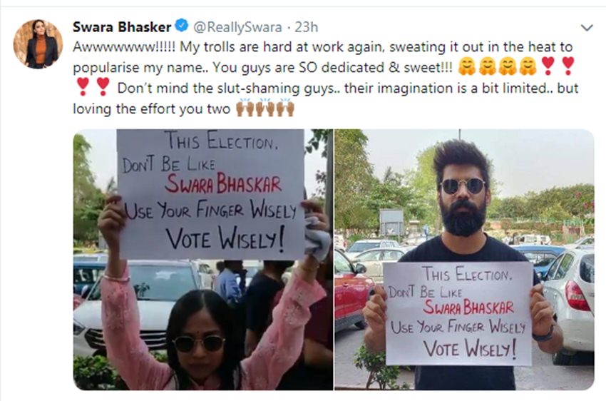 देश में आम चुनाव हो रहे हैं। सात में से चार चरणों के लिए मतदान भी पूरे हो चुके हैं। इन सबके बीच फिल्म एक्ट्रेस स्वरा भास्कर को मतदान के नाम पर ट्रोल किया जा रहा है। कुछ लोग स्वरा की फिल्म वीरे दी वेडिंग के मास्टर्बेशन सीन पर चुटकी लेते हुए कह रहे हैं कि इस चुनाव में स्वरा भास्कर ना बनें, अपनी उंगलियों का सही इस्तेमाल करें, सोच समझ कर वोट करें। दरअसल एक्ट्रेस स्वरा भास्कर ने अपने ट्विटर अकाउंट से दो तस्वीरें शेयर कीं। इन तस्वीरों में एक लड़का और एक लड़की ने अपने हाथो में प्लेकार्ड ले रखे हैं। इस पर लिखा है- इस चुनाव में स्वरा भास्कर ना बनें, अपनी उंगलियों का सही इस्तेमाल करें, सोच समझ कर वोट करें।