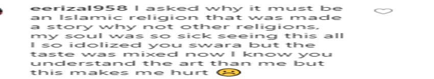 स्वरा द्वारा अपने इंस्टा पर शेयर किए गए पोस्टर पर एक यूजर ने लिखा- तू है भी इसी औकात की। बकरी भी पाल ले, पान खाकर मुंह लाल भी कर ले। एक अन्य यूजर ने लिखा- मैंने पूछना चाहता हूं कि ऐसी फिल्म के लिए इस्लामिक धर्म ही क्यों, कोई धर्म क्यों नहीं। यह सब देखकर मैं काफी दुखी हूं। स्वरा मैं आपको आइडल मानता हूं लेकिन अब बदल रहा है। आप मुझसे ज्यादा कला के बारे में जानती हैं लेकिन इससे मुझे काफी हर्ट किया है।