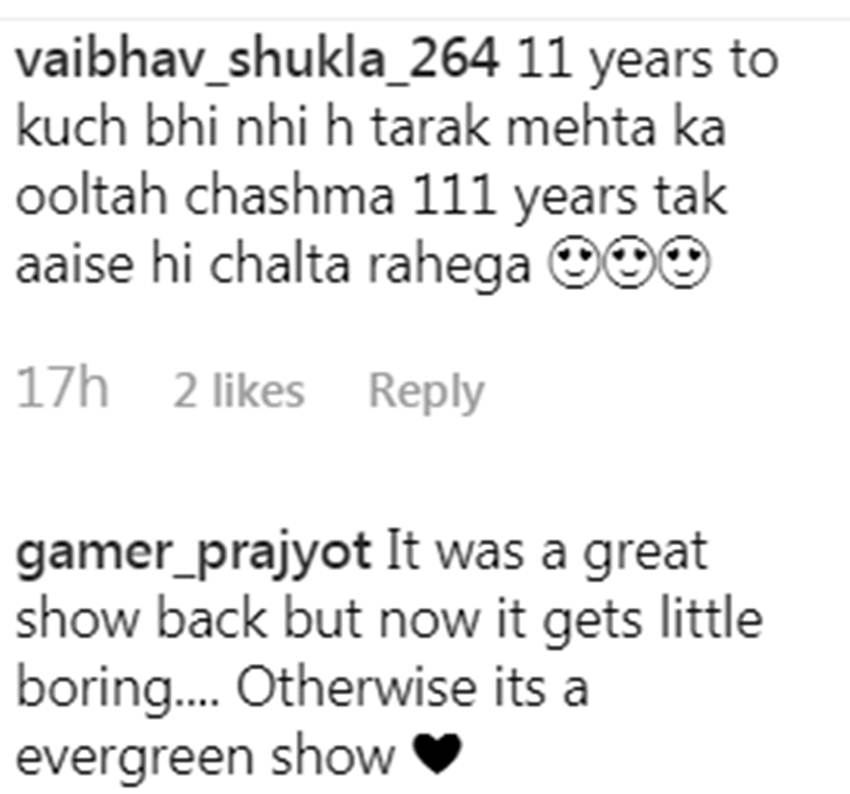 एक यूजर ने लिखा- मुझे आपका शो बहुत पसंद है। मैं शो को रिपीट मोड पर देखता हूं। भगवान का शुक्र है कि शो बिना किसी रूकावट के लंबे समय से चल रहा है। वहीं एक अन्य यजर ने लिखा- 11 साल पूरे होने पर तारक मेहता शो की टीम को बधाई और शो ऐसे ही 111 सालों तक चलता रहेगा।