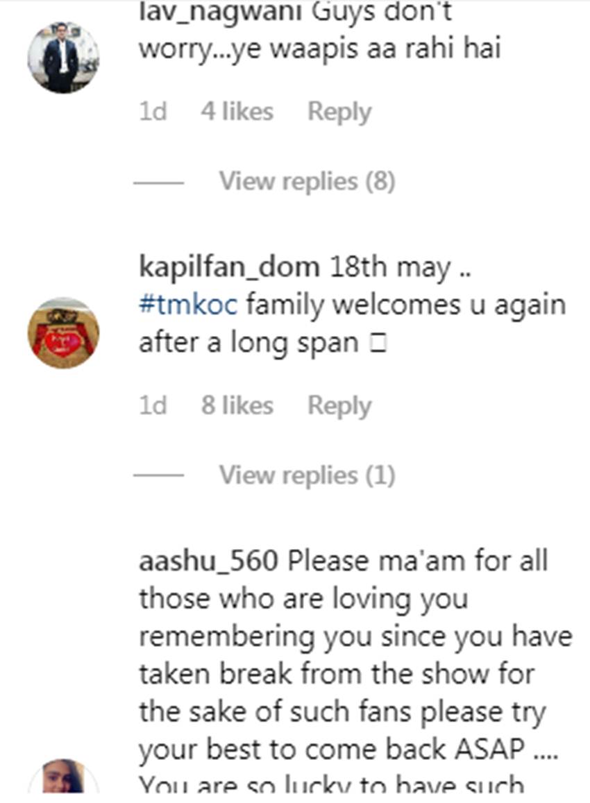 दिशा वकानी इस तस्वीर में दयाबेन के किरदार में नजर आ रही हैं। तस्वीर के साथ दिशा ने कैप्शन लिखा- ‘मुस्कान हमेशा फैशन में होती है।’ दिशा वकानी ने तस्वीर में ग्रीन कलर की साड़ी पहनी हुई है। तस्वीर को देखकर लगता है कि मानों यह तारक मेहता के शूटिंग सेट पर ली गई है। दिशा की तस्वीर को देखने के बाद लोग अपना रिएक्शन भी जाहिर कर रहे हैं। एक यूजर ने लिखा- परेशान मत हो तुम लोग, यह वापस आ रही हैं। वहीं एक अन्य यूजर ने लिखा- 18 मई को तारक मेहता शो में स्वागत है। वहीं एक इंस्टा हैंडल ने लिखा- प्लीज मैम जो लोग आपको तारक मेहता शो के किरदार के कारण प्यार करते हैं, उन्हें याद करते हुए शो में शानदार वापसी करिए। लंबे समय का अंतराल होने के कारण आज के दर्शक इस किरदार को भूल गए हैं।