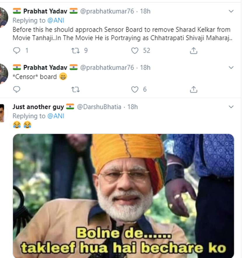 तो वहीं सोशल मीडिया पर कुछ लोग इसके विपरीत भी नजर आए। एक यूजर ने लिखा- इससे पहले तो सेंस र बोर्ड को लपेटे में लेना चाहिए क्योंकि शरद केलकर ने तो फिल्म में छत्रपति शिवाजी महाराज का किरदार निभाया है। तो वहीं दूसरे यूजर ने भी यही कहा- सेंसर बोर्ड। तो कोई पीएम मोदी की फोटो के साथ उन लोगों का मजाक उड़ाता दिखा जो लोग वीडियो के खिलाफ हैं।