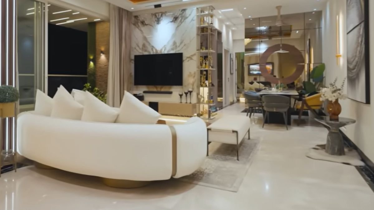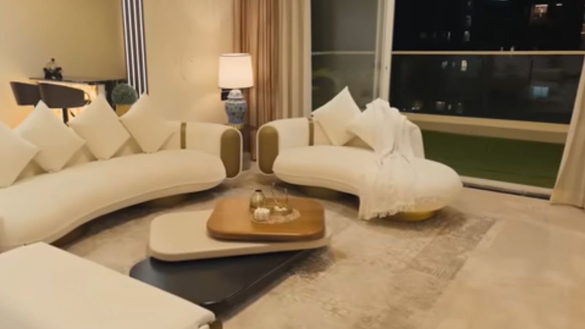 आगे बढ़ते हुए अभिनेत्री ने अपने घर का लिविंग रूम दिखाया, जो बेहद ही शानदार था। उनके लिविंग रूम में व्हाइट, बेज, ब्लैक और महरून कलर देखने को मिले, जिनका इस्तेमाल बहुत ही सोच समझकर किया गया है। वहीं, पास में टीवी पैनल और उनकी जीती हुई ट्रॉफी के लिए भी स्पेस दिया गया है।