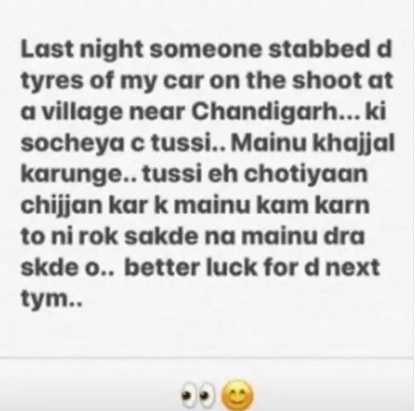 एक्ट्रेस ने लिखा कि, ‘बीती रात मैं चंड़ीगढ़ के पास एक गांव में शूटिंग कर रही थी। इस दौरान किसी ने मेरी कार के टायर काट दिए। तुमने क्या सोचा था ये सब करके तुम मुझे बर्बाद कर दोगे। इस तरह की बचकानी हरकतें करके तुम मुझे काम करने से नहीं रोक सकते। तुम्हारा ये हमला मुझे नहीं डरा सकता। दूसरी बार हमला करने के लिए तुम्हें अच्छी किस्मत की जरुरत पड़ेगी। हालांकि इस घटना के पीछे कौन है और क्या हिमांशी उस शख्स को जानती हैं या नहीं इस बात को खुलासा अभी नहीं हो पाया है।