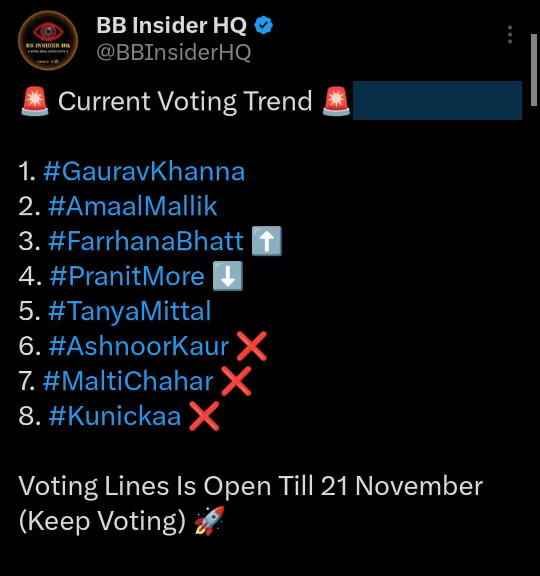 सोशल मीडिया पर वायरल वोटिंग ट्रेंड्स के अनुसार, गौरव खन्ना सबसे ज्यादा चर्चा में हैं। उनकी रणनीति और खेल को लेकर नजरिये की खूब तारीफ हो रही है। फरहाना भट्ट, अमाल मलिक और अशनूर कौर, सभी उनके साथ मजबूती से खड़ी हैं। प्रणीत मोरे और तान्या मित्तल को मिला-जुला रिस्पॉन्स मिल रहा है और वीकेंड का वार से पहले वोटों में जरा सा भी बदलाव पूरी स्थिति को पलट सकता है।