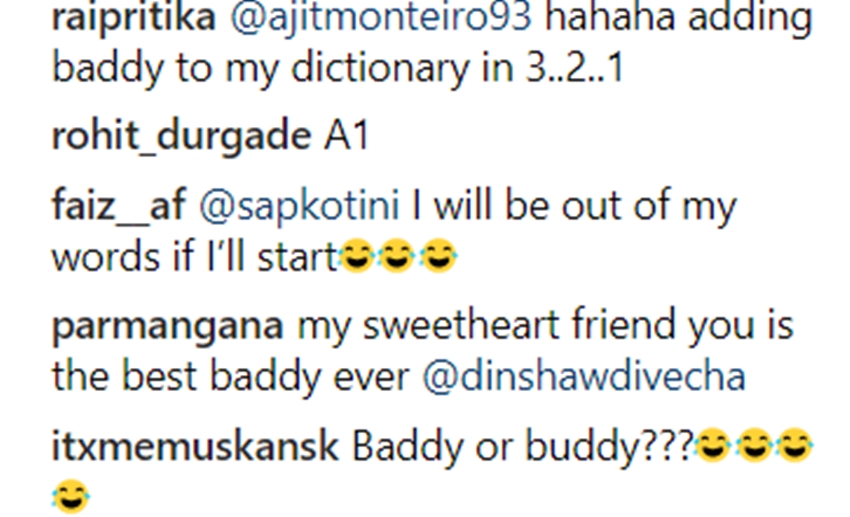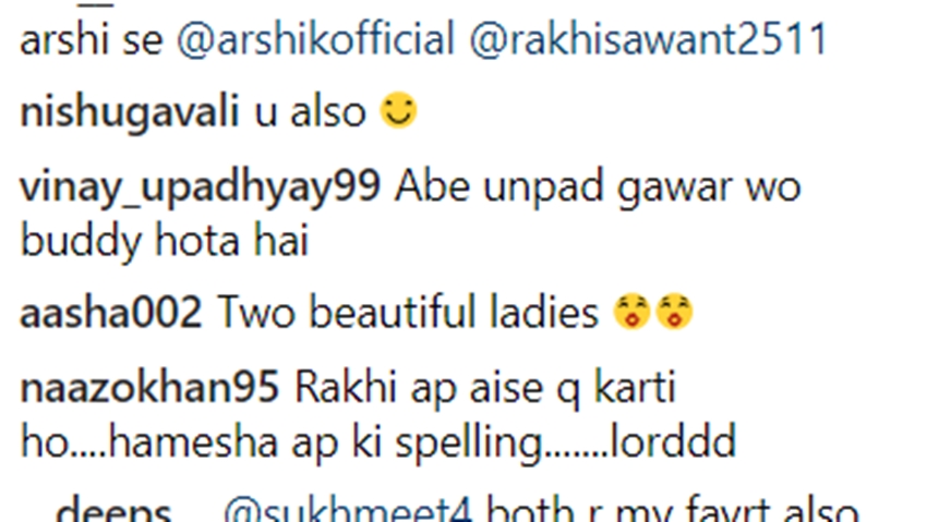 इस तस्वीर को शेयर करने के बाद कमेंट बॉक्स पर यूजर्स के कई सारे कमेंट्स आने लगे। इसके चलते लोगों ने राखी का मजाक उड़ाना शुरू कर दिया। एक यूजर ने लिखा baddy नहीं buddy होता है। तो किसी ने लिखा दोनों baddyz। वहीं एक यूजर ने लिखा, ‘राखी आप हमेशा ऐसा क्यों करती हो।…’। राखी द्वारा शेयर की गई उनकी इस तस्वीर पर लोगों ने खूब चुटकी ली। नीचे देखें यूजर्स द्वारा किए गए कमेंट्स:-