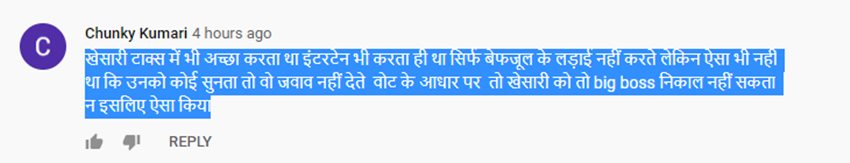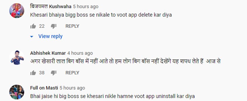 एक यूजर ने लिखा- सब की यह चाल है क्योंकि खेसारी भाई को सबसे ज्यादा वोट मिल रहा था इसलिए सबने प्लान बनाकर खेसारी भैया को निकाल दिया है बिग बॉस से मेरा यही कहना है कि उसे फिर से बिग बॉस घर में बुलाया जाए ठीक है। एक अन्य फैंस ने कहा-खेसारी टॉस्क में भी अच्छा करता थे। एंटरटेन भी करते ही थे।सिर्फ बेफजूल के लड़ाई नहीं करते लेकिन ऐसा भी नहीं था कि उनको कोई सुनता तो वो जवाव नहीं देते। वोट के आधार पर तो खेसारी को तो big boss निकाल नहीं सकता न इसलिए ऐसा किया गया।