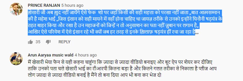 एक फैंस ने शो पर नाराजगी जाहिर करते हुए लिखा- खेसारी जी अब ख़ुद नहीं जायेंगे ऐसे फेक शो पर जहाँ किसी की सही महत्ता को परखा नहीं जाता। बात आत्मसम्मान की है। जिस इंसान को सही मायने में वहाँ होना चाहिए था जायज़ तरीके से उनको इन्होंने घिनौनी षड़यंत्र के तहत बाहर किया और रखा है उन महाजनों को जिन्हें न तो अनुसाशन का पता नहीं ज़ुबान पर लगाम है।आखिर ऐसे परिवेश में ऐसे इंसान रहे भी क्यों जब हर तरह से इनके ख़िलाफ़ षड़यंत्र हीं रचा जा रहा है।