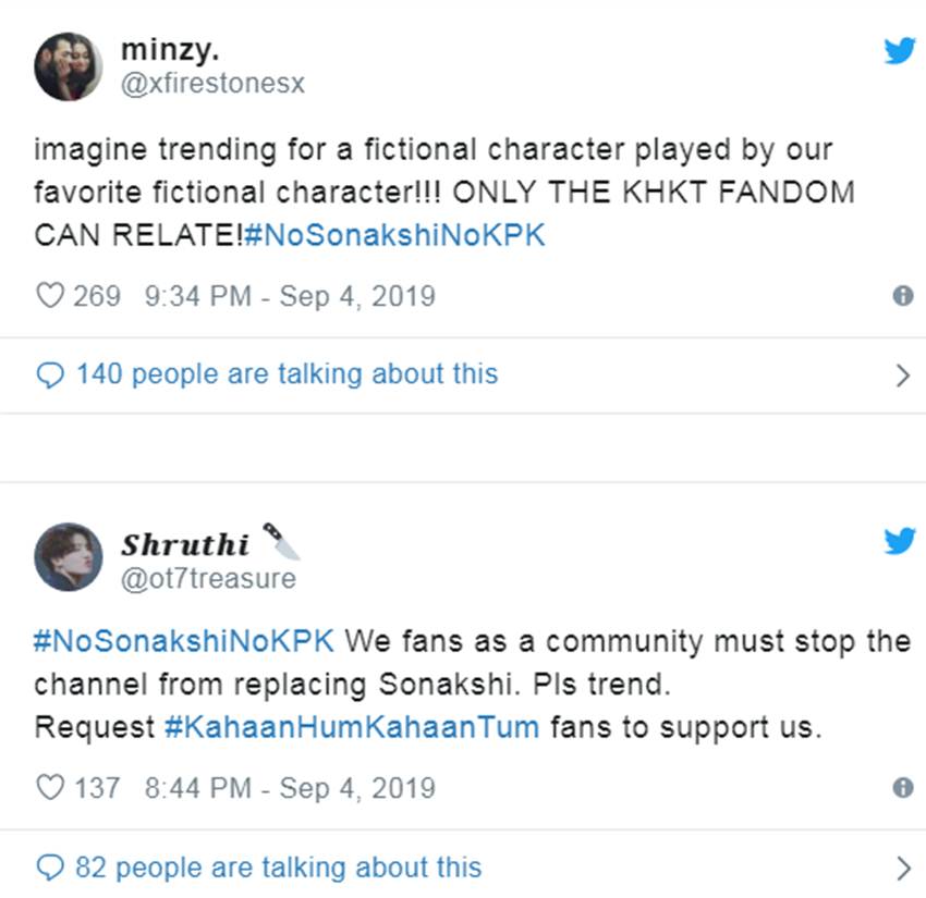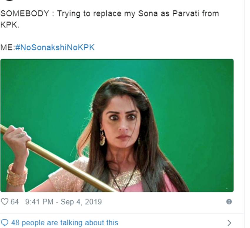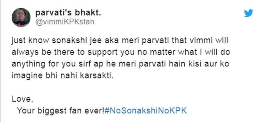एक सोशल मीडिया यूजर ने लिखा- मैं बताना चाहती हूं कि सोनाक्षी जी उर्फ मेरी पार्वती आपकी विम्मी आपको हमेशा सपोर्ट करेगी और सिर्फ आप ही मेरी पार्वती हैं और किसी को इमेजिन भी नहीं कर सकती। वहीं एक यूजर ने गुस्से वाली तस्वीर शेयर करते हुए लिखा- जब कोई मेरी पार्वती को रिप्लेस करने की कोशिश करता है।