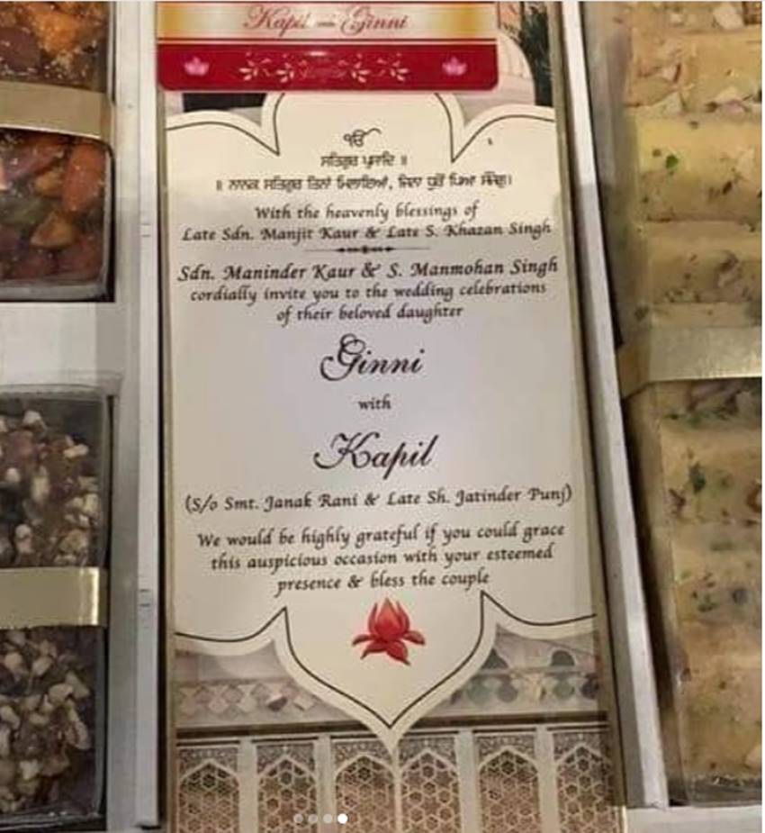 बता दें, कपिल शर्मा गिन्नी से 12 दिसंबर को शादी करने जा रहे हैं। कुछ दिनों पहले ही कपिल ने अपनी शादी की खुशखबरी फैन्स को सोशल मीडिया के माध्यम से दी थी। अब कपिल की शादी के कार्ड फैन्स के सामने रिवील हो गए हैं। कपिल की शादी का कार्ड बहुत ही सिंपल और स्वीट है। कपिल की शादी के कार्ड के साथ तरह तरह की मिठाइयां भी दिखाई दे रही हैं। कपिल अपनी शादी जालंधर में करने जा रहे हैं। The Grand Cabbana में कपिल और गिन्नी की शादी 12 दिसंबर को संपन्न होगी।