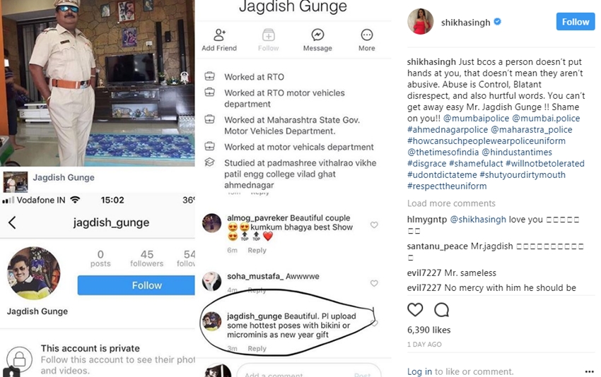 यह देखने के बाद जब शिखा को पता चला कि कमेंट करने वाला व्यक्ति एक पुलिस वाला है इसके बाद शिखा का गुस्सा फूट पड़ा। शिखा ने इस कमेंट का स्क्रीन शॉर्ट लेकर अपने सोशल मीडिया अकाउंट पर शेयर कर दिया। अपने इस पोस्ट को कैप्शन देते हुए शिखा ने लिखा, ‘ लोग आप तक पहुंच नहीं पाते सिर्फ इस वजह से यह नहीं कहा जा सकता कि वह गाली-गलौच नहीं करते हैं। अब्यूज कंट्रोल है, जबरदस्त बेइज्जती और दिल दुखाने वाले शब्द, आप इनसे बच कर नहीं भाग सकते। जगदीश गुन्गे शर्म आनी चाहिए। #मुंबईपुलिस’।