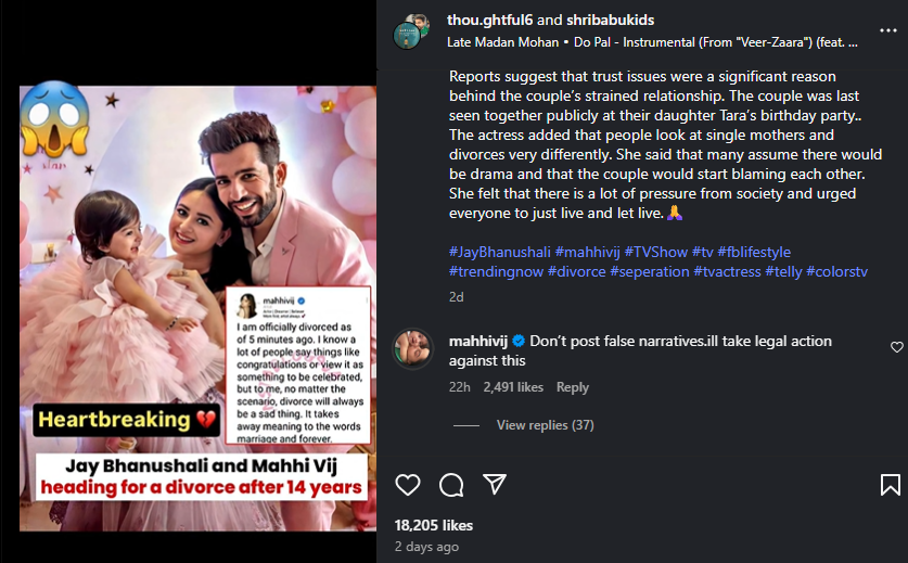 thou.ghtful6 नाम के एक इंस्टाग्राम पेज ने जय और माही के तलाक का जिक्र करते हुए पोस्ट किया था। इस पोस्ट के कैप्शन में लिखा गया था, “क्या सब खत्म हो गया? 14 साल की शादी के बाद जय भानुशाली और माही विज तलाक की तरफ बढ़ रहे हैं। सूत्रों ने पुष्टि की है कि तलाक के कागजात जुलाई और अगस्त 2025 के बीच साइन और फाइनल हो गए।