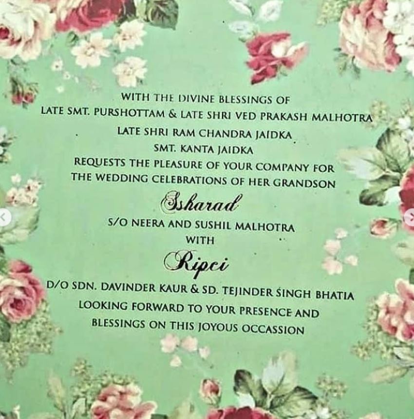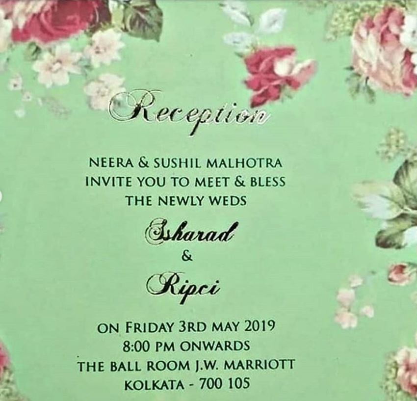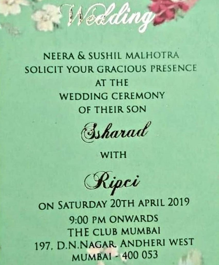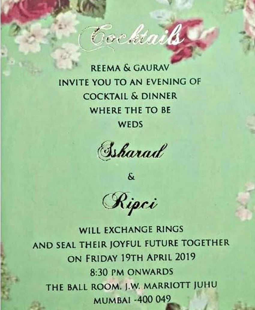 कार्ड में जानकारी दी गई है कि 19 अप्रैल को शरद और रिप्स की सगाई होगी। साथ में कॉक्टेल और डिनर का अरेंजमेंट भी होगा।