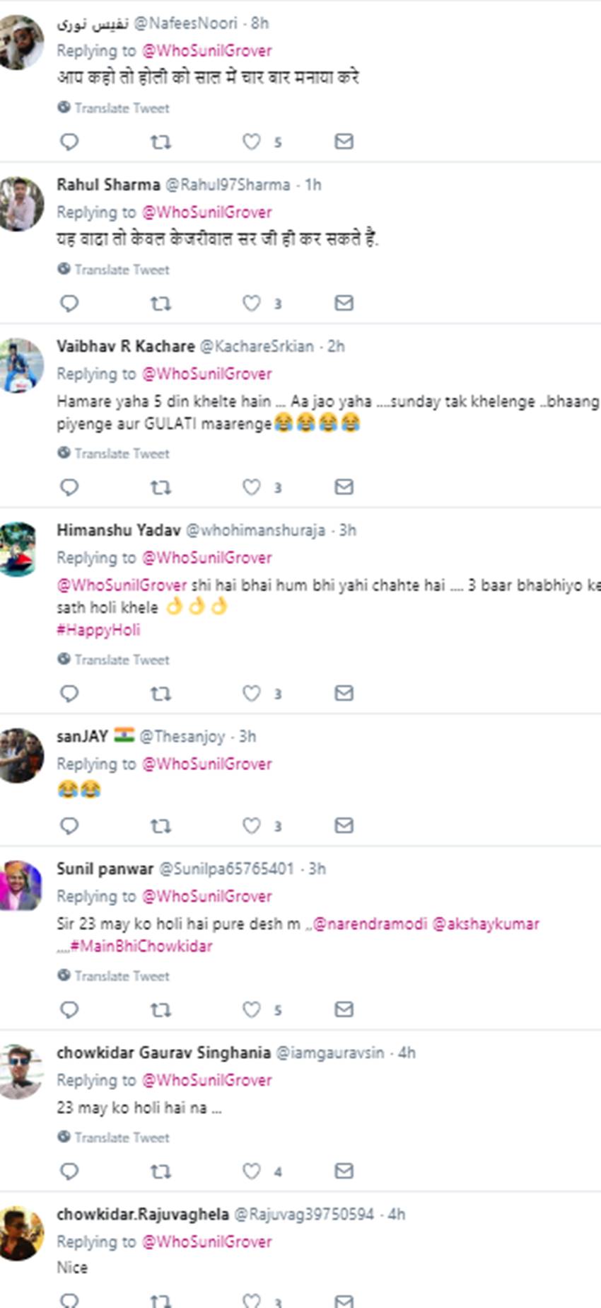 इसके अलावा कुछ फैन्स ऐसे थे कि सुनील के इस पोस्ट का जवाब वह ‘राजनैतिक हंसी के गुल्लों’ में देने लगे। एक फैन ने लिखा-‘ये वादा तो केवल केजरीवाल ही कर सकते हैं’। तो किसी ने सेम लाइन लिखी लेकिन केजरीवाल का नाम हटा कर राहुल गांधी का नाम लिया जाने लगा। एक फैन ने तो सुनील को अपने घर ही इंवाइट कर लिया। फैन ने लिखा- ‘हमारे यहां आ जाओ, यहां हम 5 दिन मनाते हैं होली। भांग खाएंगे और गुलाटी मारेंगे’।