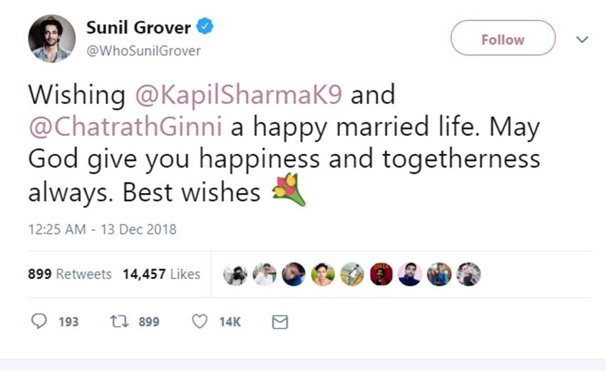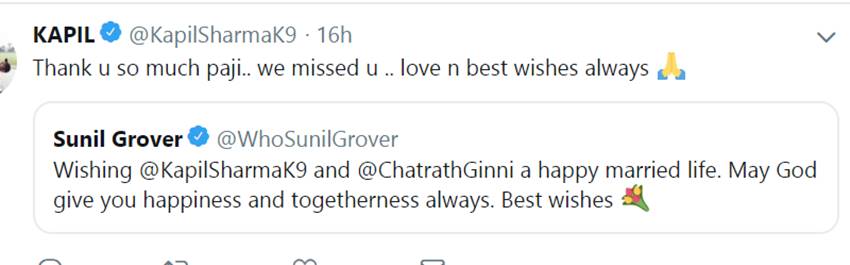 सुनील ग्रोवर ने अपने ट्वीट पर कपिल को शादी की मुबारकबाद देते हुए कहा,’कपिल शर्मा और गिन्नी को शादी की ढेरों शुभकामनाएं। आपकी शादीशुदा जिंदगी खुशियों से भरी हों। भगवान आपको बहुत सारी खुशियां एक साथ दे।’ सुनील ग्रोवर ने कपिल शर्मा को 13 दिसंबर 2018 को ट्वीट किया था। वहीं कपिल ने 3 दिसंबर 2019 को सुनील के ट्वीट का रिप्लाई किया।