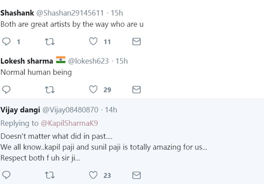 एक फैन ने लिखा कि ये सब भी आम लोगों की तरह ही हैं। यह नॉर्मल ह्यूमन बींग हैं। बता दें, बीते वक्त कपिल शर्मा और सुनील ग्रोवर के झगड़े की खूब चर्चा हुई थी। खबर थी कि कपिल शर्मा ने फ्लाइट में सुनील ग्रोवर के साथ हाथापाई की थी। इसके बाद से कपिल और सुनील ग्रोवर की राहें अलग हो गई थीं। सुनील ग्रोवर ने कपिल के साथ काम करना छोड़ दिया और अलग-अलग कॉमेडी शो में काम करते दिखाई दिए।