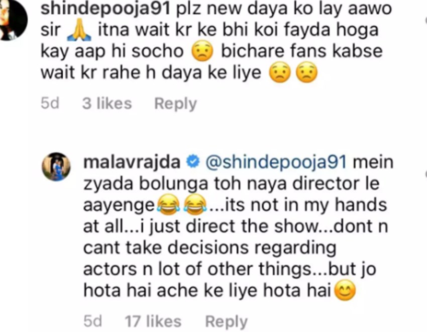 ऐसे में जब एक यूजर ने Malav Rajda से दयाबेन की वापसी पर सवाल किया तो मालव राजद ने भी इस यूजर को जवाब दिया। शो के डायरेक्टर से यूजर ने पूछा था-‘प्लीज न्यू दया को ले आओ वापस सर इतना वेट कर के भी कोई फायदा नहीं होगा। है कोई फायदा आप ही सोचो? बेचारे फैंस कब से वेट करक रहे हैं दया के लिए।’