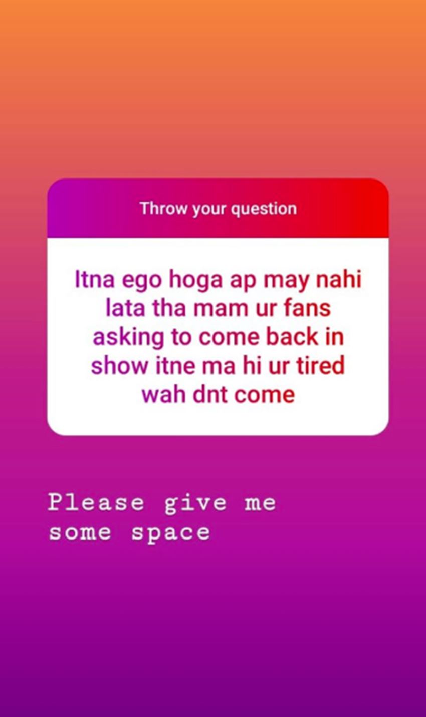 हाल ही में दिशा ने अपने फैन्स से कहा था कि उन्हें उनसे जो भी पूछना है वह पूछ सकते हैं। लेकिन वह शो से जुड़े किसी भी सवाल का जवाब देना नहीं चाहेंगी। ऐसे में एक फैन ने फिर भी दिशा से इस बारे में बात कर ली। फैन ने दिशा को लिख भेजा कि ‘इतना ईगो होगा आपमें लगता नहीं था। आपके फैन्स आपको बुलाते बुलाते थक गए। आप आ क्यों नहीं रही हो।’ ऐसे में दिशा वकानी ने भी इस फैन को जवाब दे दिया। दिशा नेजवाब में लिखा-‘कृप्या मुझे स्पेस दें।’