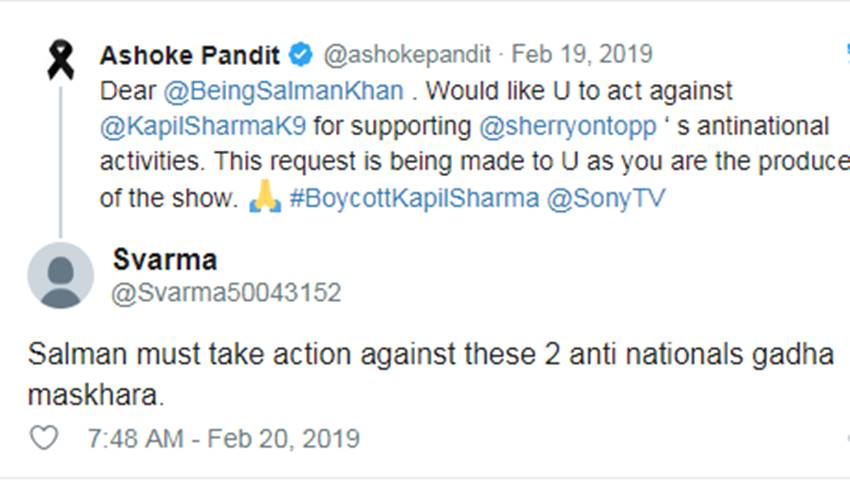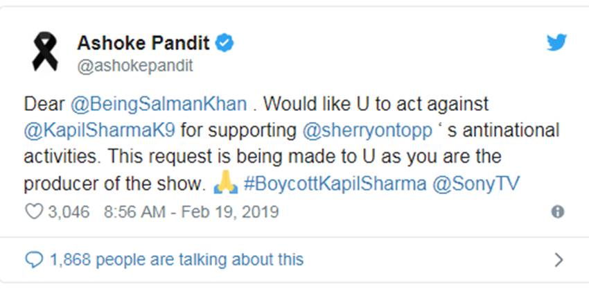 अनुपम खेर की हाल ही में आई फिल्म ‘द एक्सिडेंटल प्राइम मिनिस्टर’ के प्रोड्यूसर अशोक पंडित ने सलमान खान को एक ट्वीट पोस्ट किया है। इस पोस्ट में सलमान खान से रिक्वेस्ट की गई है कि सिद्धू के लिए जो कमेंट कपिल ने किया है उसे लेकर कॉमेडियन पर एक्शन होना चाहिए। इस ट्वीट के सामने आने के बाद कई सारे फैन्स ने इसी तरह की डिमांड सलमान को टैग करते हुए की।