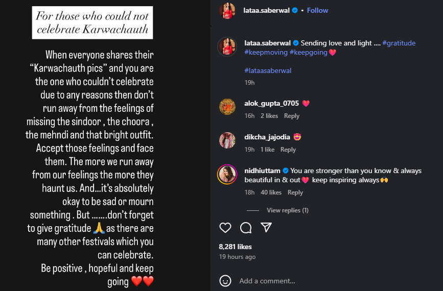 लता सभरवाल ने इंस्टाग्राम पर एक पोस्ट करते हुए लिखा, “उन लोगों के लिए जो करवा चौथ नहीं मना पाए… जब हर कोई अपनी ‘करवाचौथ की तस्वीरें’ शेयर करता है और आप ही हैं, जो किसी कारण से इसे नहीं मना पाए, तो सिंदूर, चूड़ा, मेहंदी और चमकीले कपड़े की कमी महसूस करने से पीछे ना हटें।”