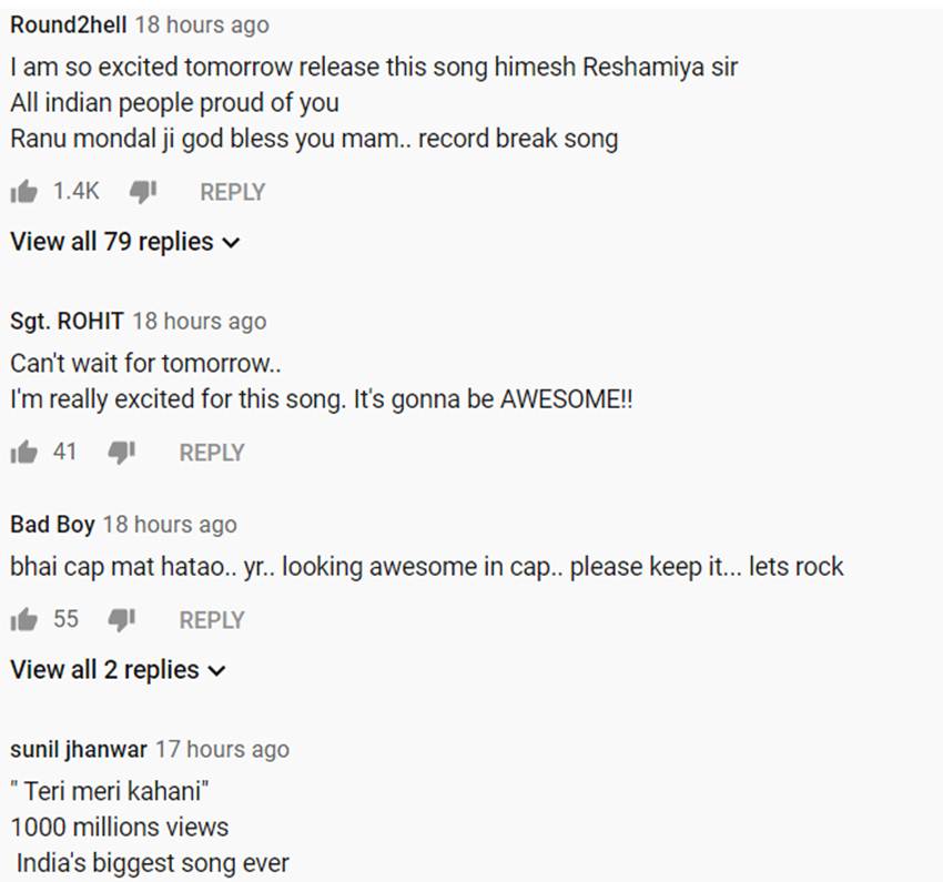 टीजर के कमेंट बॉक्स में भी यूजर्स ने गाने को लेकर अपना उत्साह जाहिर किया है। एक सोशल मीडिया यूजर ने लिखा- मैं उत्साहित हूं कि फिल्म का गाना रिलीज हो रहा है। रानू मंडल जी आपका गाना रिकॉर्ड ब्रेक करेगा। वहीं एक अन्य यूजर लिखता है- मैं सच में इस गाने के लिए बेहद उत्साहित हूं। इसी तरह कई अन्य यूजर्स ने भी अपने दिल की बात बयां की है।