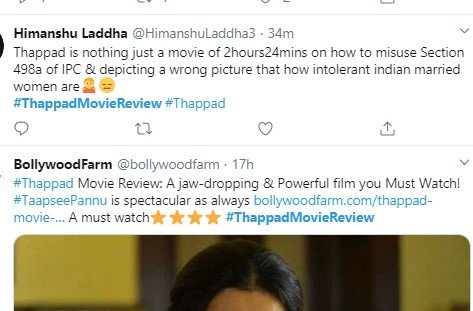 एक यूजर ने लिखा-'थप्पड़ की गूंज पूरी दुनिया में गूंज रही...।'तो एक यूजर ने कहा ये थप्पड़ का टाइम है। फिल्मो को देख कर कई लोग कह रहे हैं कि ये फिल्म बेकार है। कई यूजर्स तो ये भी कह रहे हैं कि इस फिल्म को देख कर पब्लिक तापसी को ऐसा थप्पड़ मारेगी कि मेकर्स दोबारा फिल्म नहीं बनाएंगे ऐसी।' थप्पड़ के सपोर्ट में उतरे फैंसकह रहे हैं- अबे जाओ, तुम थप्पड़ मारने वालों का जमाना गया।