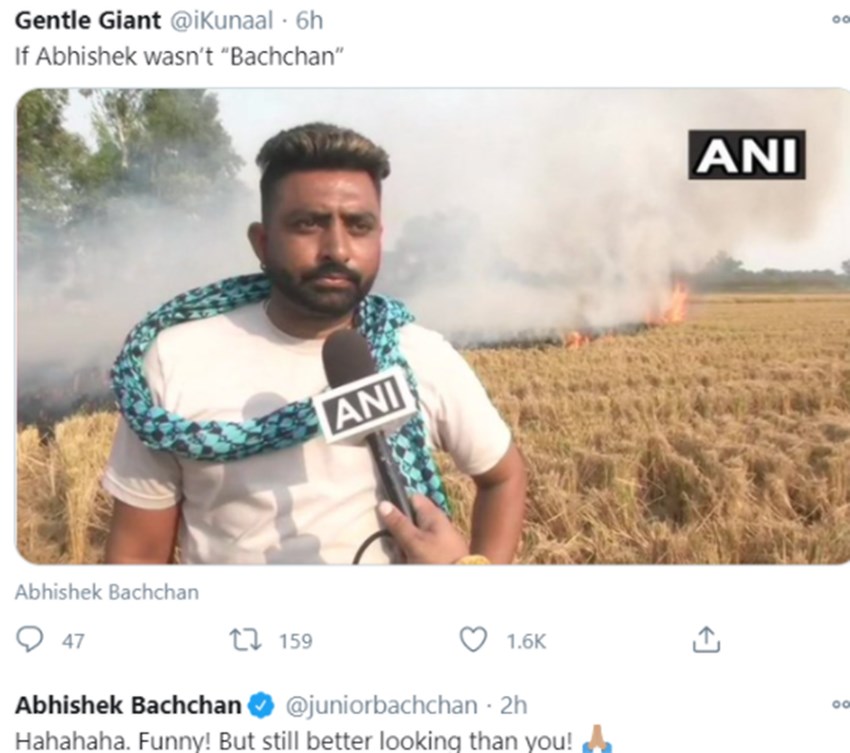तो वहीं एक बार यूजर ने अभिषेक को उनकी एक्टिंग को लेकर कमेंट किया था। यूजर ने एएनआई की एक तस्वीर शेयर की थी जिसमें अभिषेक जैसा शख्स दिखाई दे रहा था, उसके पीछे पराली जलती दिख रही थी। ऐसे में इस यूजर ने इस तस्वीर को शेयर कर लिखा था अगर अभिषेक ‘बच्चन’ न होता। इस पर अभिषेक ने भी इस यूजर को करारा जवाब दिया था- अभिषेक ने लिखा था-हाहाहा फनी लेकिन तुमसे तो बहुत ही अच्छा लग रहा है।