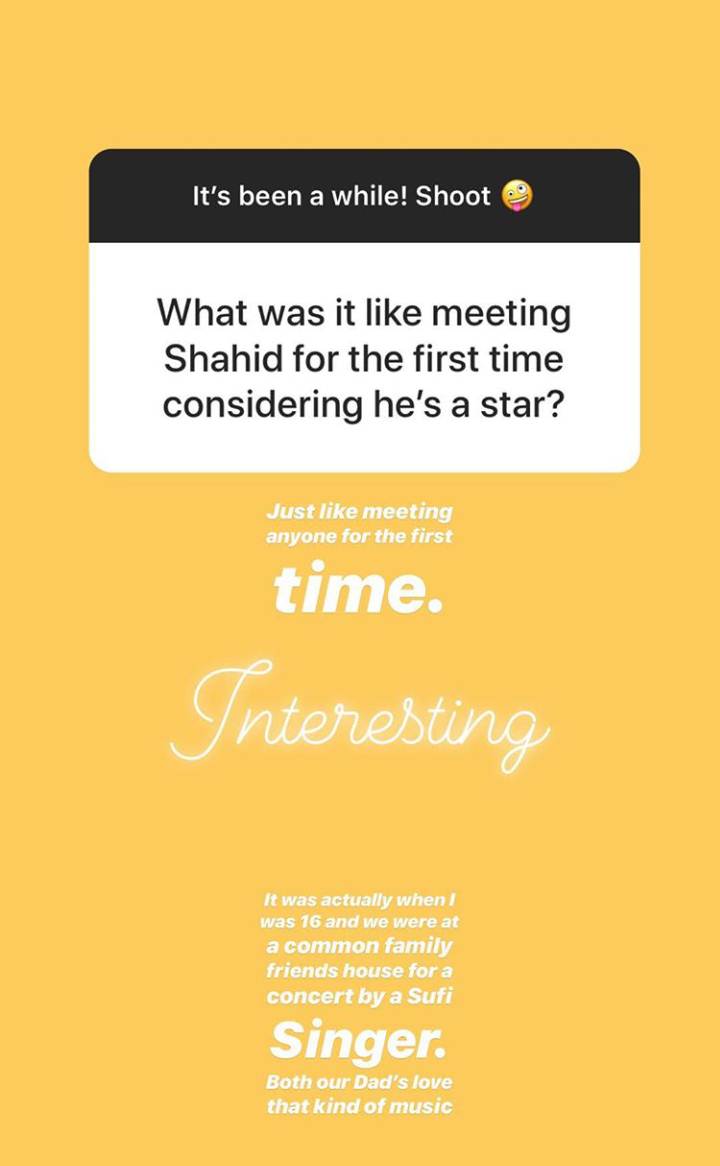 दरअसल, मीरा से एक फैन ने सवाल किया कि शाहिद कपूर से पहली बार मिलने पर कैसा लगा था? जवाब में मीरा ने लिखा, ‘जैसा किसी से पहली बार मिलने पर लगता है वैसा ही। मीरा ने इस मुलाकात को दिलचस्प बताया।’ मीरा ने आगे लिखा- ”यह तब हुआ था जब मैं 16 साल की थी। हम एक फैमिली फ्रेंड के घर सूफी सिंगर के कॉन्सर्ट में मिले थे। हम दोनों के ही पिता को इस तरह का संगीत पसंद है।”