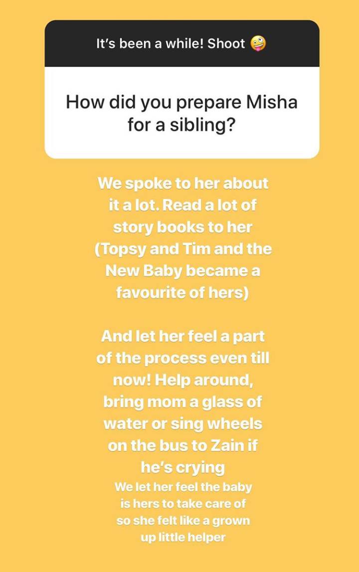 वहीं एक अन्य फैन ने मीरा से मजेदार सवाल करते हुए पूछा कि उन्होंने मीशा को भाई जैन के लिए कैसे तैयार किया था? मीरा ने जवाब में लिखा- ”हमने मीशा से इस बारे में खूब बातें कीं। हमने उसे भी इस प्रक्रिया का हिस्सा बनाया, जो कि वह आज तक बनीं हुई है। मां की मदद करना, उनके लिए पानी लाना हो या रोने पर जैन को चुप कराना हो। हमने मीशा को यह महसूस करने दिया कि यह उसका बच्चा है और उसे किसी बड़े की तरह महसूस कराया।”