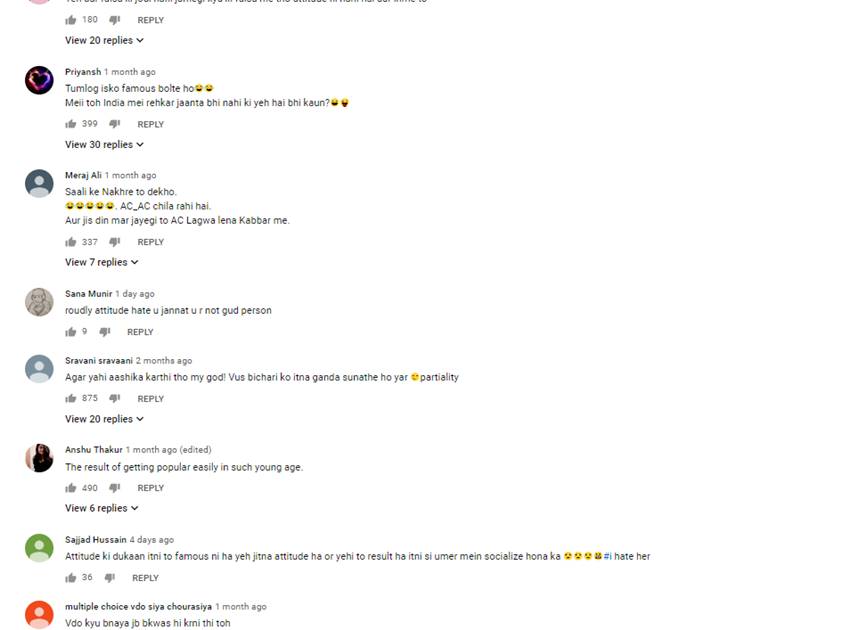 जन्नत के इस एटीट्यूड को देख कर फैंस रिएक्शन देते नजर आ रहे हैं। किसी ने इस बीच कहा कि ‘जन्नत को क्या हो गया। ये तो अच्छी लड़की है।’ तो कोई कहता दिखा- ‘हां-हां आसानी से पॉपुलैरिटी मिल गई ना इसलिए ऐसा एटीट्यूड हो गया है।’ कोई कहता नजर आया- ‘इनके नखरे तो देखो, मैडम बड़ी स्टार नहीं बनी हो।’ किसी ने कहा- ‘एटीट्यूड की दुकान इतनी भी फेमस नहीं हुई हो तुम’।