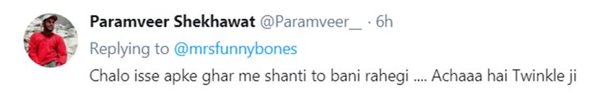 ट्विंकल की पोस्ट पर सोशल मीडिया यूजर्स उन्हें जमकर ट्रोल कर रहे हैं। एक यूजर ने लिखा- अगर पहले ध्यान लगाया होता तो शायद 1-2 फिल्म हिट हो जातीं। वहीं एक अन्य यूजर ने लिखा- बिल्कुल, इससे तुमको मदद मिलेगी। अच्छे रिजल्ट के लिए भगवा पहन लें। जय हिंद। एक अन्य यूजर लिखता है- चलो ट्विंकल जी इससे आपके घर पर शांति बनी रहेगी, अच्छा है। एक यूजर ने अक्षय कुमार को टैग करते हुए लिखा- ‘हम आपको बहुत प्यार करते हैं लेकिन आपकी पत्नी बहुत इरिटेट कर देती हैं।’