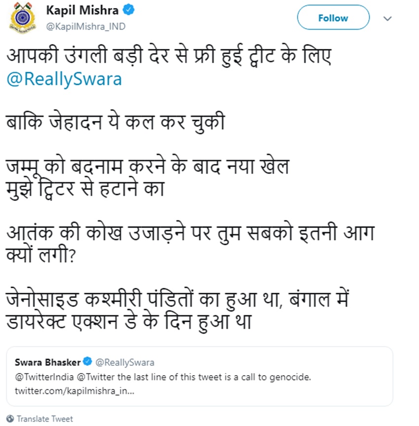 अभिनेत्री की इस ट्वीट पर नजर पड़ते ही कपिल मिश्रा ने एक बार ट्वीट किया। इस बार कपिल मिश्रा ने स्वरा भास्कर को जवाब देते हुए लिखा कि ‘आपकी उंगली बड़ी देर से फ्री हुई ट्वीट के लिए…बाकि जेहादन ये कल कर चुकी…जम्मू को बदनाम करने के बाद नया खेल मुझे ट्विटर से हटाने का। आतंक की कोख उजाड़ने पर तुम सबको इतनी आग क्यों लगी? जेनोसाइड कश्मीरी पंडितों का हुआ था, बंगाल में डायरेक्ट एक्शन डे के दिन हुआ था।’ कपिल मिश्रा के इस ट्वीट के बाद अभिनेत्री ने एक बार इसपर अपनी प्रतिक्रिया दी। इस बार स्वरा भास्कर ने ट्वीट करते हुए लिखा कि ‘यह विकृत मानसिकता हमारे देश के एक चुने हुए प्रतिनिधि की है।’ अभिनेत्री और राजनेता के इस ट्विटर वार पर कई लोगों ने भी अपनी प्रतिक्रियाएं दीं।